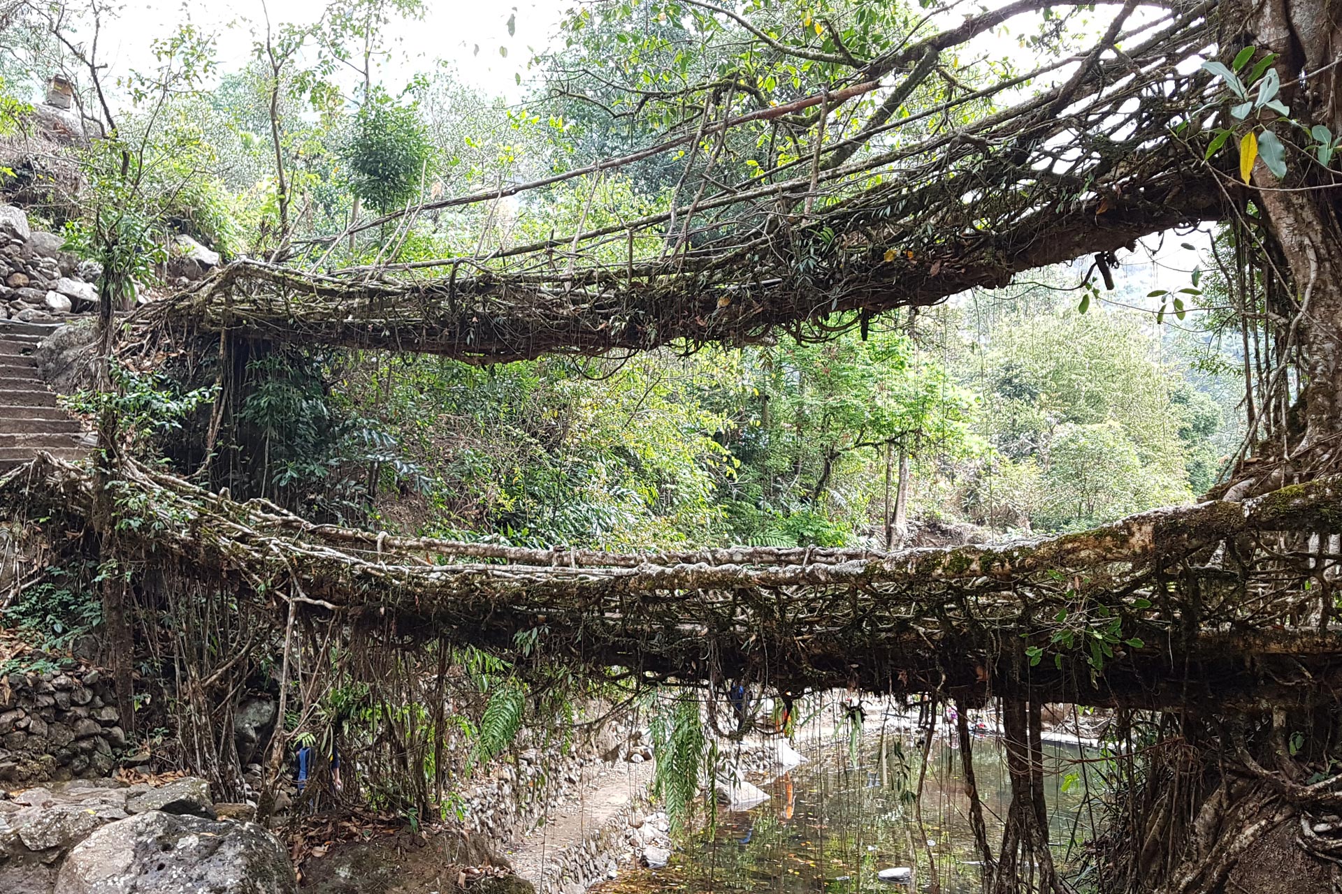 This bridge is formed by guiding the roots of rubber trees across streams until they naturally merge. Found in several places across Meghalaya, it is a marvel of bio-engineering. The bridge blends beautifully into the rainforest surroundings.